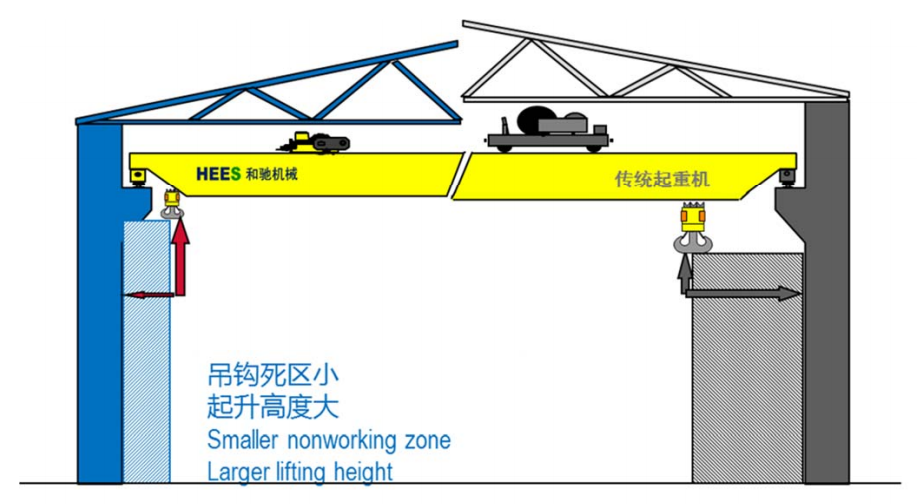 ? 改造選用和馳起重機,可以降低起重機對已有廠房的壓力,極大的提升起升高度,擴大廠房的使用面積